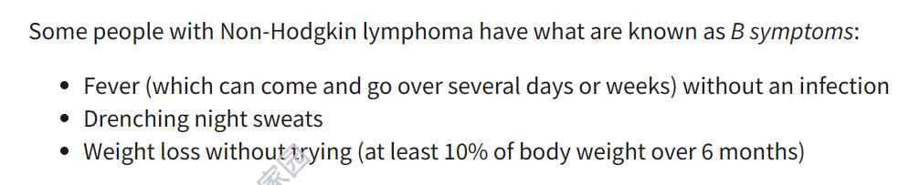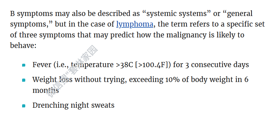 很多患者对于B症状,了解一些,但不够确切,我综合了上面三家的定义,大家参考: