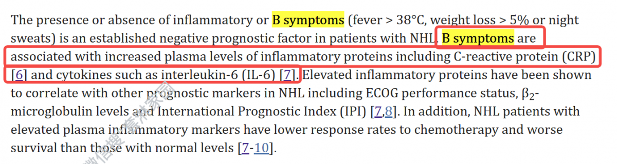 文献解释,B症状与血浆中的炎症蛋白(包括C反蛋白、白介素-6)的水平升高有关。