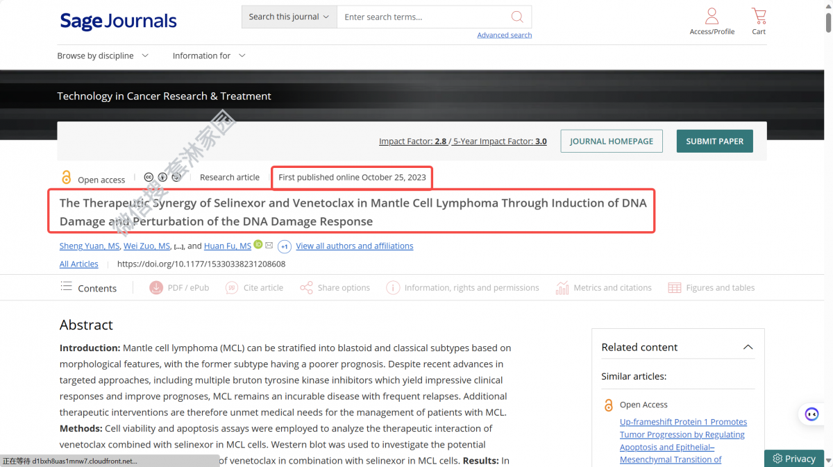 Yuan S, Zuo W, Liu T, Fu H. The Therapeutic Synergy of Selinexor and Venetoclax in Mantle Cell Lymphoma Through Induction of DNA Damage and Perturbation of the DNA Damage Response. Technol Cancer Res Treat. 2023 Jan-Dec;22:15330338231208608. doi: 10.1177/15330338231208608. PMID: 37880950; PMCID: PMC10605683.