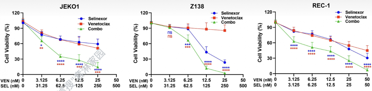 2. JEKO1(经典型组),250nM单药赛丽尼索,加上25nM的维奈克拉,导致癌细胞生存能力(纵轴-Cell Viability)为15%,也就是85%的癌细胞都死了;