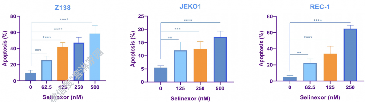 1. Z138(母细胞1组),250nM单药赛丽尼索导致差不多48%的癌细胞死亡;