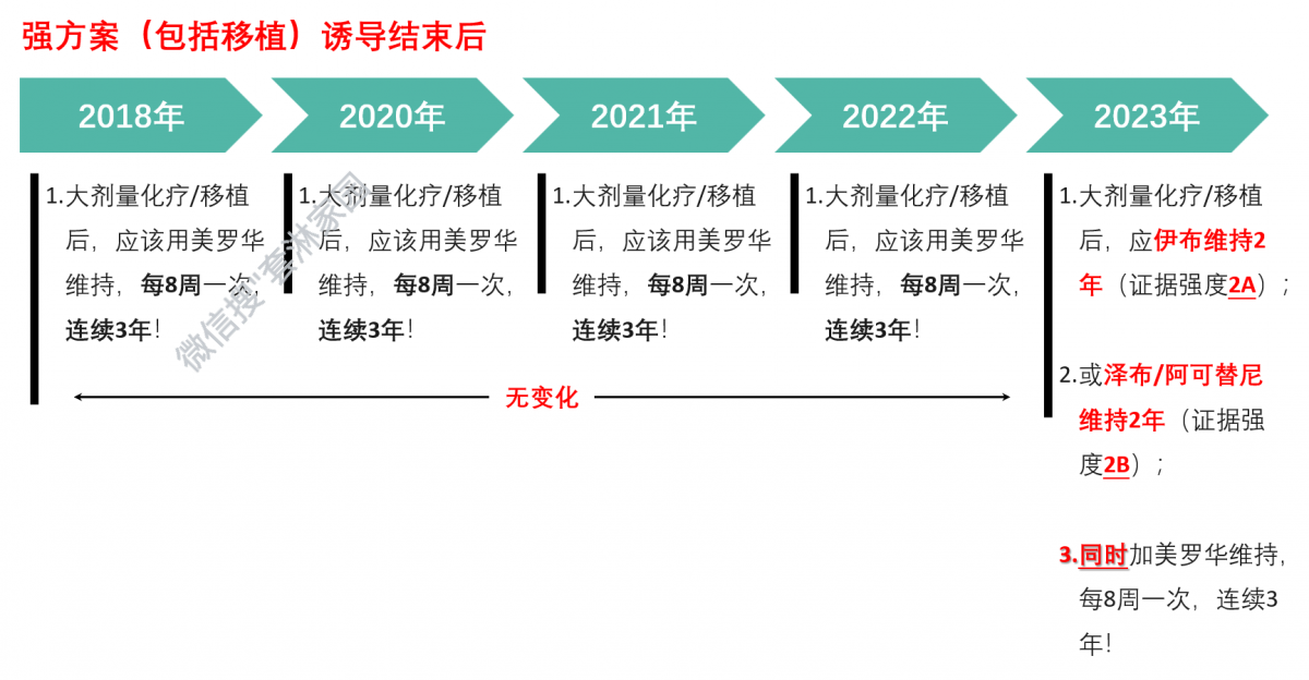 强方案:伊布替尼维持2年(证据强度:2A),或者泽布替尼/阿可替尼维持2年(证据强度2B),再同时加上美罗华维持,每8周一次,连续3年!(特大变化)