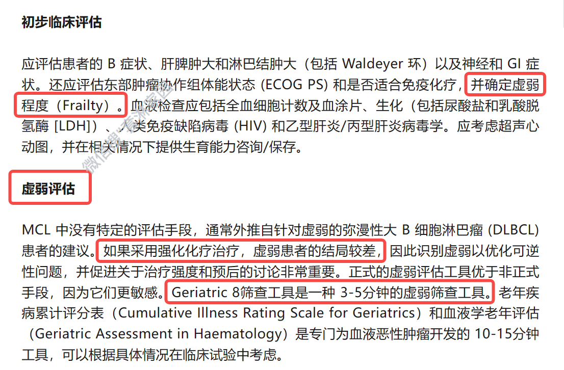 2023年,英国血液年会套细胞淋巴瘤指南,明确指出,需要对患者进行虚弱评估。