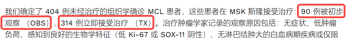 我们找到这段话里面的参考文献:(Kumar A, Ying Z, Alperovich A, Dogan A, Hamlin P, Moskowitz C, et al. Clinical presentation determines the selection of patients for initial observation in mantle cell lymphoma. Haematologica. 2019;104(4):e163–6.)