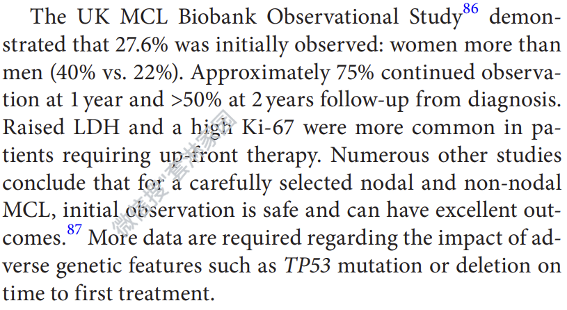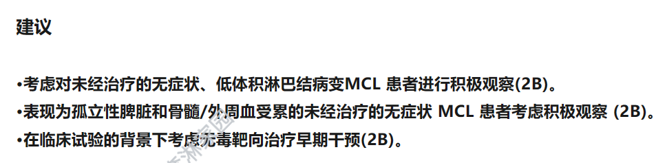第一点:考虑对未经治疗的无症状、低体积淋巴结病变MCL患者进行积极观察。看懂了吗你?